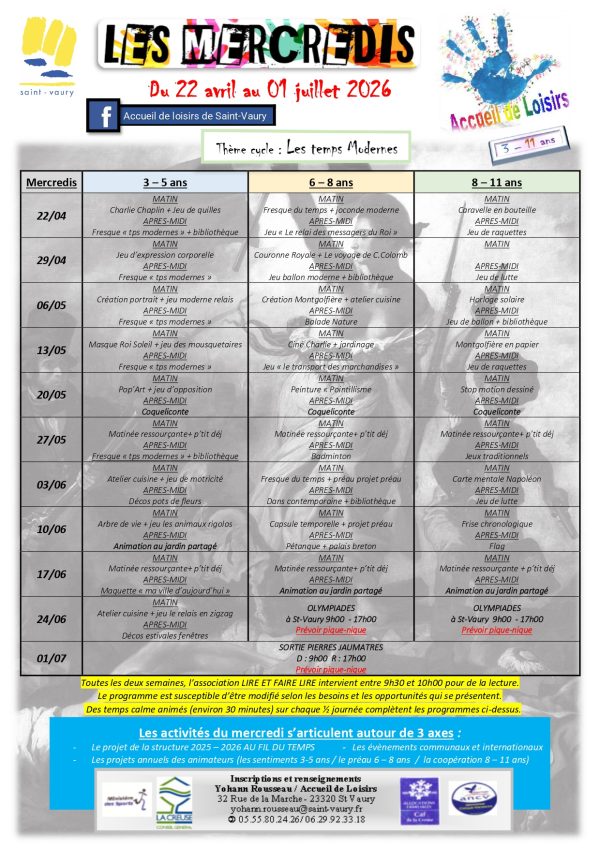 INSCRIPTION et PROGRAMME pour les mercredis du 22avril au 01 juillet 2026 ActualitésPar secretariat30 mars 2026Laisser un commentaire2026 04 Inscription MERCREDIS MAI JUIN2026 Cycle 5 Planning d’activités MERCREDIS